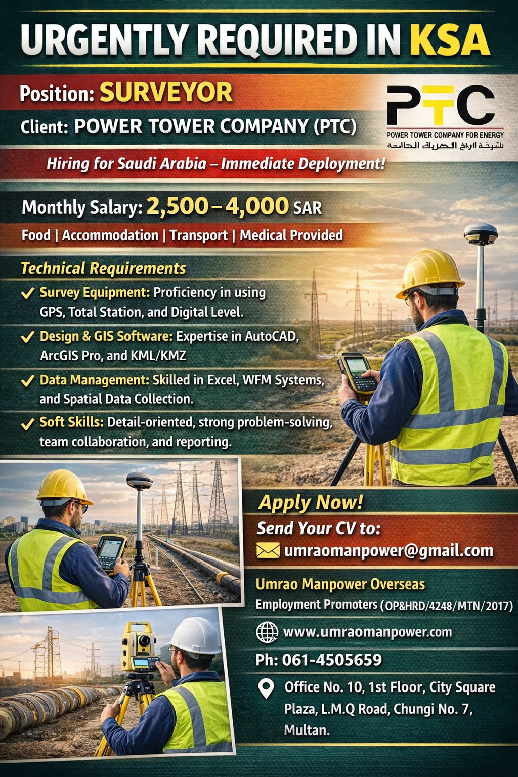 We are looking for a Certified Surveying Specialist (Saudi Council of Engineers) for immediate deployment to Saudi Arabia. Candidates must have 5+ years of expertise in surveying and geospatial data management for utility infrastructure projects.
