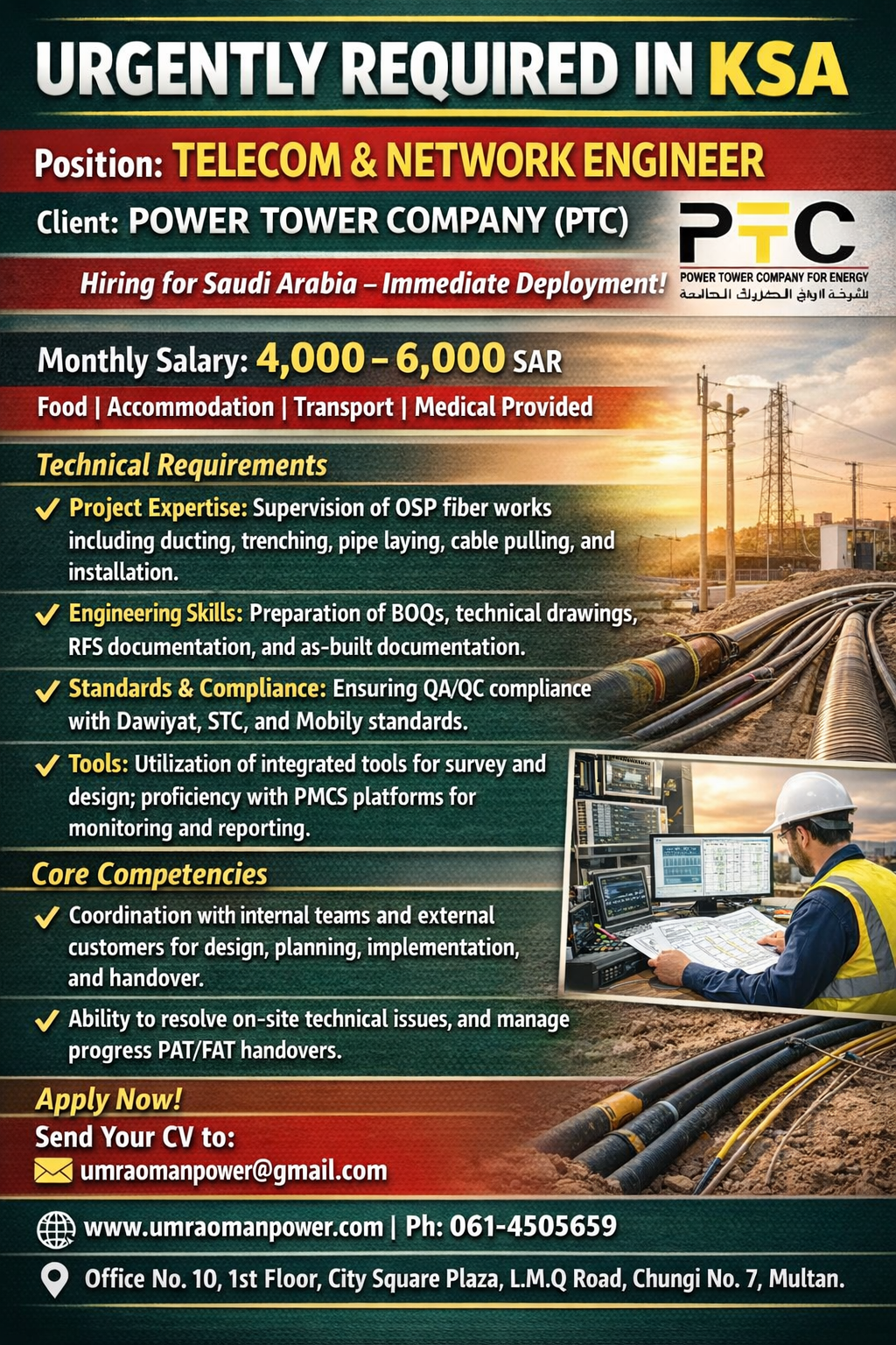 We are urgently seeking skilled Telecommunication Technicians for our prominent client, Power Tower Company (PTC), in the Kingdom of Saudi Arabia. The ideal candidate will have extensive experience in fiber optic infrastructure, from physical installation to advanced technical testing.